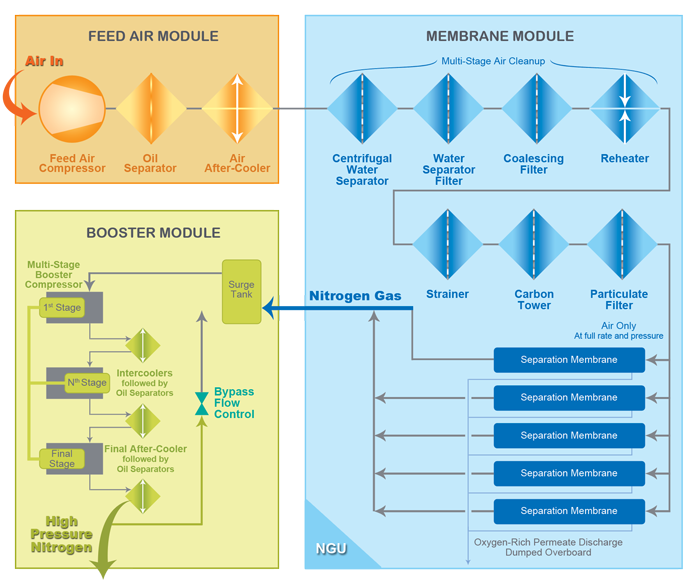 The membrane separates the original gas mixture into two streams. One stream, the permeate, is concentrated in oxygen, carbon dioxide and water vapor. The other stream, the product, is high-pressure nitrogen. The permeate is vented to the atmosphere. The product, nitrogen, exits the downstream end of the membrane at near feed air pressure and is delivered to the end user or booster if further compression is required.